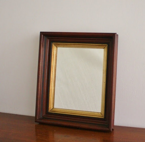 Vintage wood mirror, decorative border, gold trim, wall. Now mirrors can be cut in a variety of intricate shapes and bevels. 35cm length x 21cm width.
